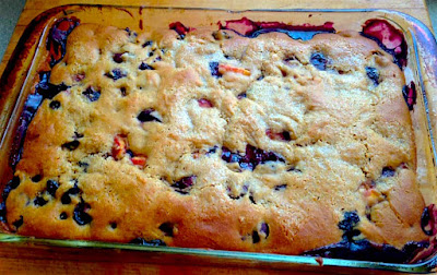 It's that time of year when the farmers markets are overflowing with goodies, and we invariably buy too much fruit because we can't help ourselves. Sadly, it's also that time of year when it's usually too hot to bake, but this morning I got up early enough to justify turning on the oven and transforming our glut of dirt candy into this splendid cobbler (or crumble, or buckle, or whatever. These distinctions exhaust me). Compared to most such recipes, I use relatively little sugar - fruit is sweet, kids! - and not much fat, so this dish is as good for breakfast as dessert, accompanied by yogurt rather than vanilla ice cream. (Or not; it's your call!)